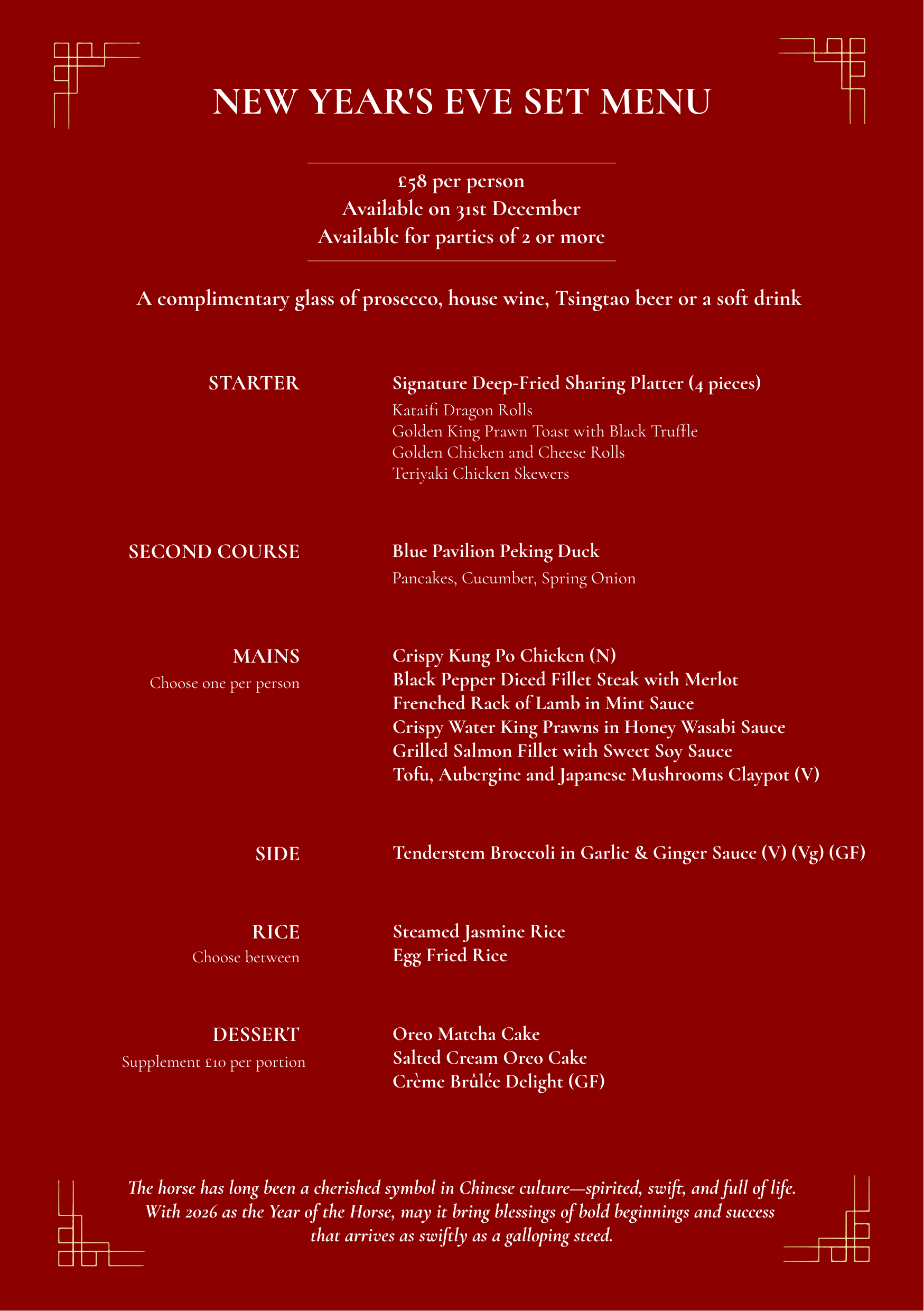 Available on the 31st December, you can enjoy our classic mains such as Crispy Kung Po Chicken and Grilled Salmon Fillet, with fruity and floral house wines.